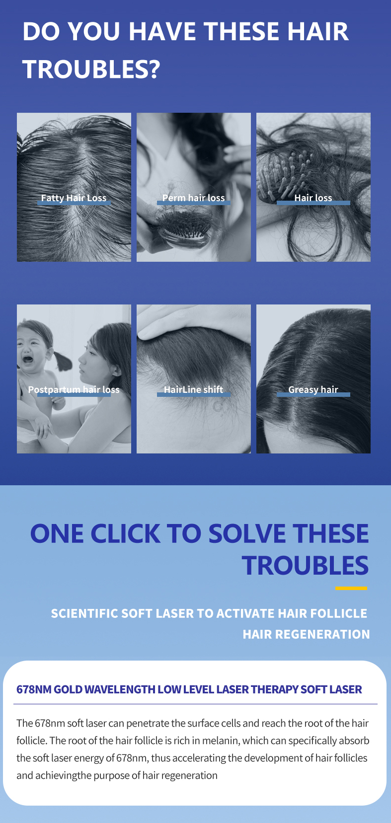 Casca de păr cu laser conține 80 de puncte de iradiere cu laser, casca este, de asemenea, bogată în picioare de silicon, poate trage părul, astfel încât laserul să ajungă direct la foliculul de păr și să obțină cel mai bun efect de păr, acoperirea sa este mare și emisia laser. lungimea de undă este precisă, ceea ce poate fi comparabil cu clinicile de sănătate utilizate pe scară largă.