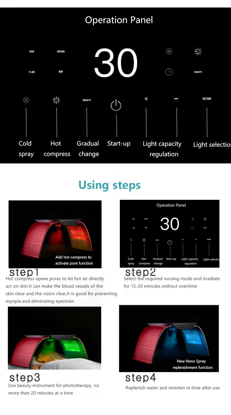 Lumina LED este utilizarea unor lungimi de undă specifice de lumina care dau energie care sunt folosite în multe aplicații, acest lucru fiind cunoscut sub numele de foton. Stativul LED pentru diodă emițătoare de lumina, diode da energie sub formă de lumina, puternic, luminos, eficient, și sunt folosite pentru a ucide bacteriile care cauzează pete. Tratamentul mai multor aspecte ale îmbătrânirii pielii, studii multiple au demonstrat îmbunătățirea ridurilor fine, hiperpigmentarea pătimită, rugozitatea tactilă și gravitatea. Aceste rezultate sunt susținute atât de producția de colagen, cât și de creșterea proliferării. Tratamentul cu LED-uri pentru piele este cel mai eficient dacă este folosit zilnic în zonele afectate. Adolescenți, va rugăm să aveți răbdare și să va folosiți Masca LED de zi cu zi, dacă este posibil, pentru a ucide orice bacterie care provoacă pete. Pentru a îmbunătăți Masca LED și pentru a inova fotonică, va recomandăm să consultați un dermatolog sau esthetician calificat împreună cu un bun produs de acnee de actualitate. Produsul acneic local NU trebuie utilizat înainte de a folosi Masca LED, dar poate fi aplicat ulterior.