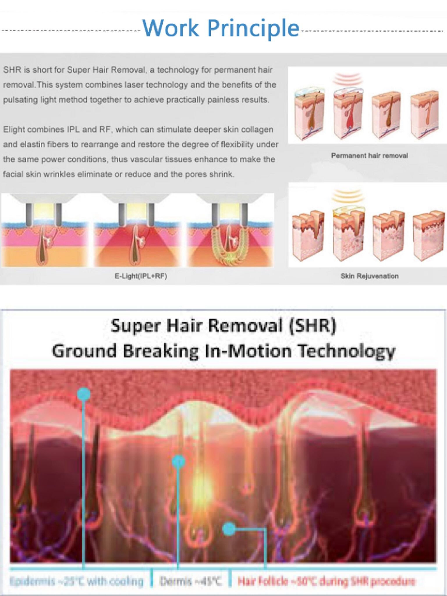 Echipamentul ultraperformant funcționează pe principiul fototermolizei selective, ceea ce presupune atingerea unor temperaturi foarte înalte pentru a distruge foliculul de par, fără afectarea țesutului din jur.