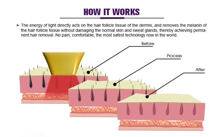 Echipamentul ultraperformant funcționează pe principiul fototermolizei selective, ceea ce presupune atingerea unor temperaturi foarte înalte pentru a distruge foliculul de par, fără afectarea țesutului din jur.