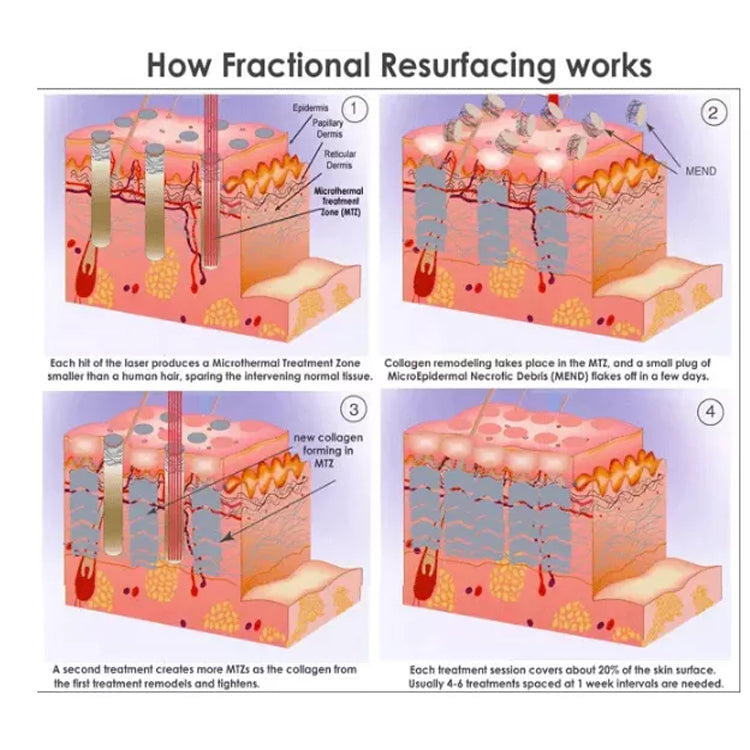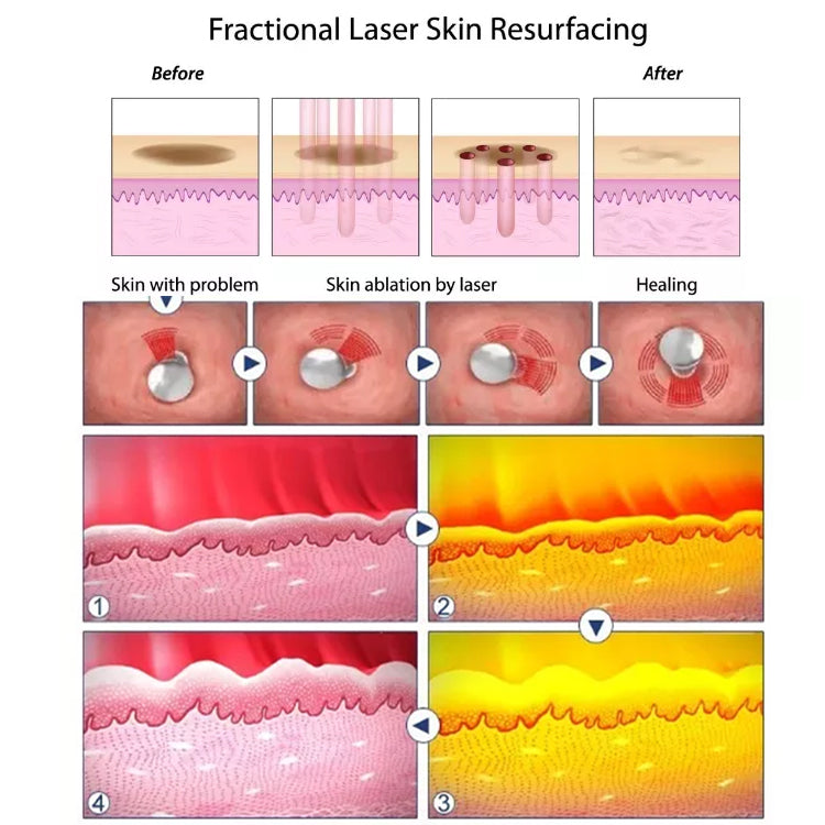Laserul fracțional Co2 penetrează pielea și formează canale termice minuscule. Acest lucru creează un efect termic ablativ numai pe aceste canale (o micro-vătămare) fără a deteriora țesutul din jur. Țesuturile din jurul micro-leziunilor (aproximativ 15-20% din suprafața de tratament) încep procesul de vindecare. Pe măsură ce colagenul remodelează, pielea este intărită, cicatricile și leziunile pigmentate sunt îmbunătățite.