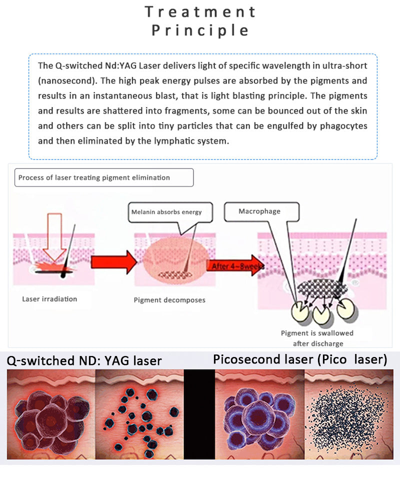Laserele folosesc energia luminoasă, care, trecând printr-un mediu solid (de exemplu, cristal de neodymium-doped yttrium aluminum gârneț- ND-YAG sau cristal de Alexandrite), mediu lichid (pulsed dye laser) sau mediu gazos (dioxid de carbon - CO2), își selectează o anumită lungime de undă care să servească perfect scopului propus. Rază laserului este emisă asupra pielii și se absoarbe în mod selectiv la nivelul țesutului – țintă, în funcție de culoarea pe care o are acesta (roșu, albastru, maro) sau de conținutul de apă al acestuia. După absorbție, energia luminoasă se transformă în căldură, distrugând țesutul-țintă (de exemplu, rădăcina firului de păr, vasele de sânge superficiale, petele maro determinate de soare etc.).