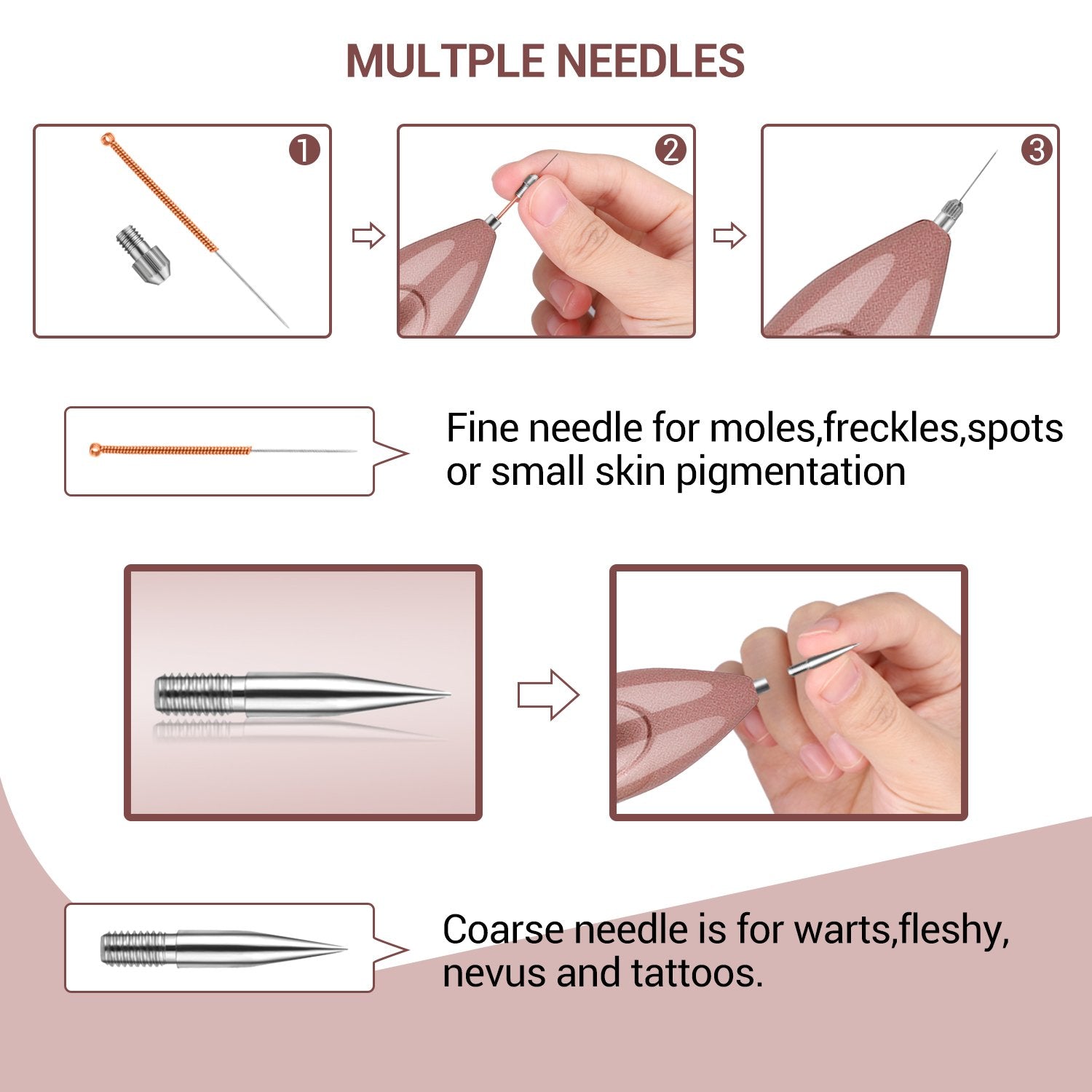 2. Ac grosier (reutilizabil): Selecția nivelului este 5-9. Se aplică alunitelor mai mari, cum ar fi veruci, verrucă, tatuaje, alunițe mai mari, pistrui și tatuaje. Introduceți-l în stilou și strângeți-l în sensul acelor de ceasornic.