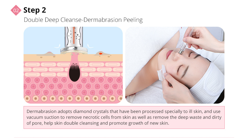 Microdermabraziunea oferă o procedura de chirurgie a pielii nechirurgicale prin utilizarea capetelor de diamante sterile pentru curățarea și frecarea celulelor moarte de pe stratul superior al pielii, urmată de aspirarea / aspirarea îndepărtării particulelor împreună cu orice murdărie și pielea moartă.