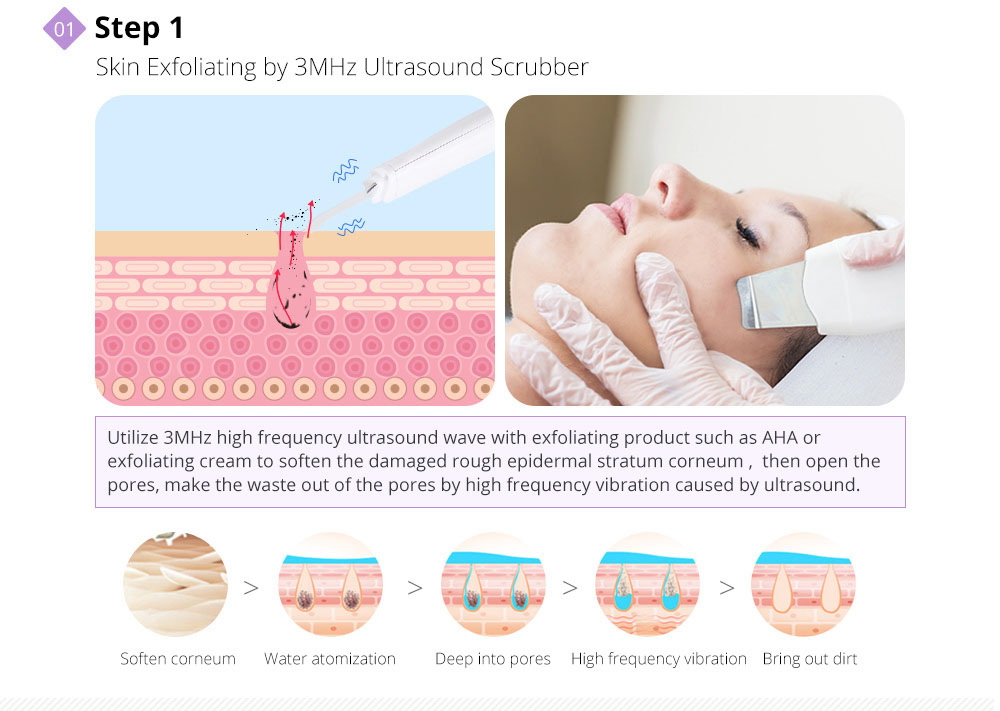Metabolizarea lentă a pielii, împreună cu influență ultravioletelor (UV) provoacă precipitații de melanină și formarea de pete întunecate și pistrui. Prin oscilația cu ultrasunete, pătrundeți în adâncul derului, și curățați adânc murdăria din piele, celulele senescențe și stratul corneu;