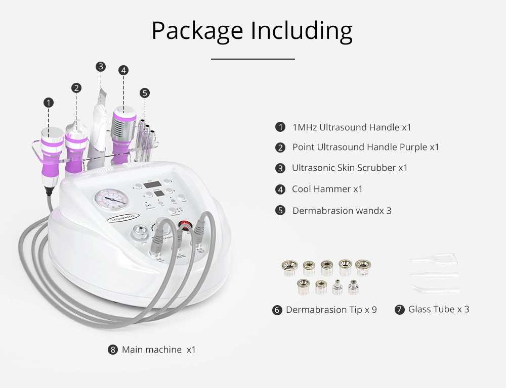 Diamantul din vârful microdermabraziunii este de fapt mii de particule minuscule de diamant de dimensiuni uniforme. Aparatul de microdermabraziune cu diamant are o varietate de dimensiuni diferite. Utilizarea corectă a capului de diamant depinde de starea pielii individuale a pacientului: 100 este, desigur, pielea; piele normală 200; piele sensibilă 300.