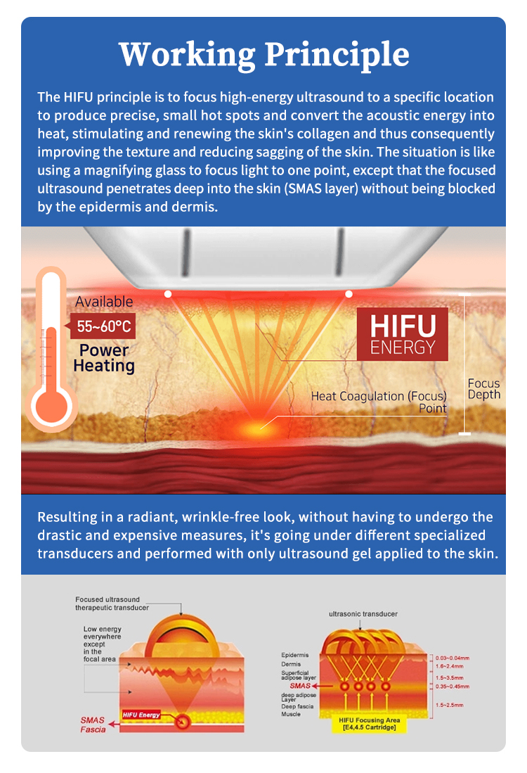 Ultrasunetele focalizate de înaltă intensitate (HIFU) furnizează în mod direct energie termică pielii și țesutului subcutanat care poate stimula și reînnoi colagenul pielii și, prin urmare, îmbunătățește textura și reducând lăsarea pielii. Obține literalmente rezultatele unui lifting facial sau unui lifting corporal fără nicio intervenție chirurgicală invazivă sau injecții, în plus, un bonus suplimentar al acestei proceduri este că nu există timp de întrerupere. Și, de asemenea, funcționează la fel de bine pentru persoanele de toate culorile de piele, în contrast cu cel al laserelor și al luminilor cu puls intens. Principiul ultrasunetelor focalizate liposonice de înalta intensitate penetrează energia ultrasonică concentrată și volumetrică la adâncime precisă (13 mm) în straturile de grăsime subcutanata care vizează țesutul adipos, provocând un efect non-termic. Structurile din jur, cum ar fi epiderma, vasele de sânge și nervii, nu vor fi deteriorate. Între timp, conținutul metabolizat (trigliceride, acizi grași) al celulelor va fi excretat în afară corpului automat prin circulația sângelui și drenajul limfatic, fără a afecta organismul uman.