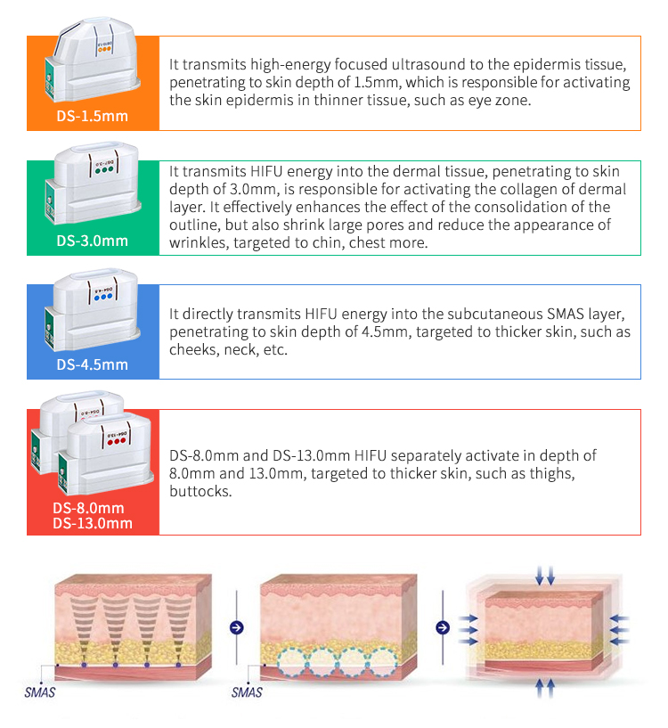 DS-1.5mm folosit pentru a transmite ultrasunete concentrate de înaltă energie către țesutul epidermei, ultrasunetele pentru a pătrunde în piele la o adâncime de 1,5 mm, este responsabil pentru activarea epidermei pielii în țesutul mai subțire. cum ar fi zona ochilor.