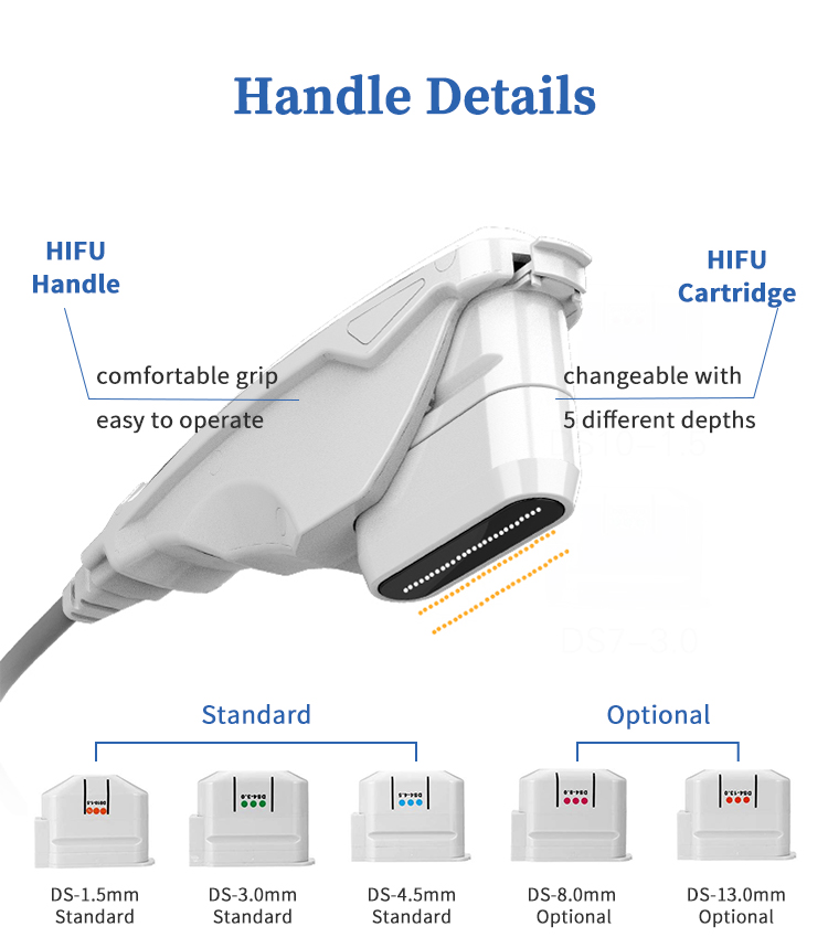 DS-4.5mm folosit pentru a transmite ultrasunete concentrate de înaltă energie către piele, țesutul subcutanat, ultrasunetele pentru a pătrunde în piele până la o adâncime de 4,5 mm, stratul SMAS subcutanat direct, țintit pe piele mai groasă, cum ar fi obrajii, gâtul etc.