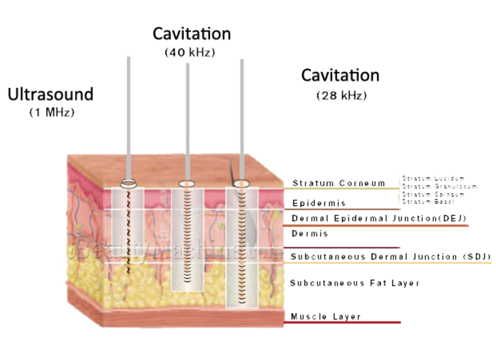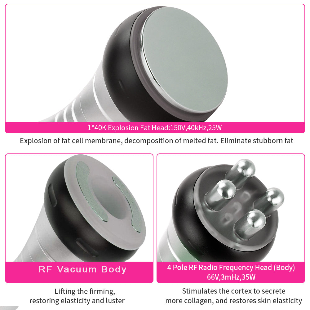 Cu un cap Puternic Cavitație cu ultrasunete 40000 HZ emis pentru a vibra celulele grase la viteză maximă și pentru a produce numeroase buzunare de aer vid în interiorul și în afară celulelor grase, impact puternic asupra celulelor grase pentru a genera explozie introvertită și a dezintegra triglicerida în glicerol și liber acizi grași.