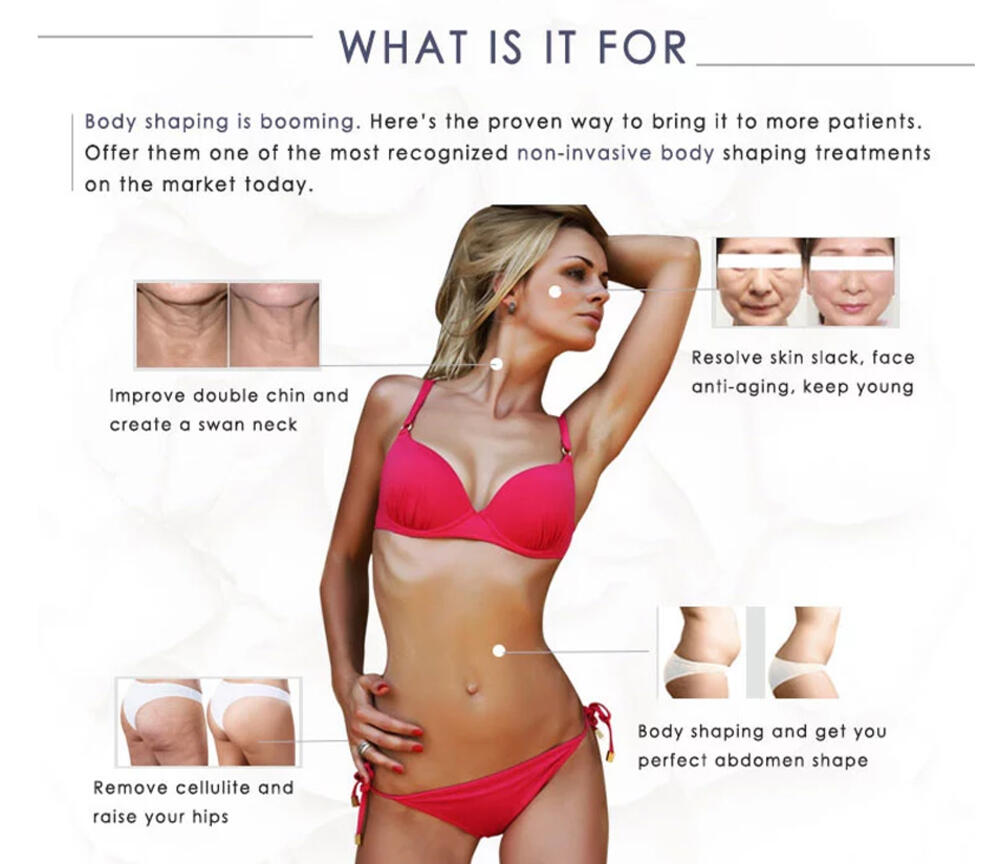 2. Reducerea grăsimii corporale: În urmă studiilor clinice, după 3-4 ședințe, au fost înregistrate diminuări remarcabile ale țesutului adipos din zona abdominală, de la 0,8+/-2.3 cm, 1.8 +/- 2.0 cm până la 2.6 +/- 1.0 cm. După două săptămâni de la prima ședința, a fost înregistrată o diminuare a țesutului adipos cu 1,5 cm în talie, 1,7 cm în zona abdominală și cu 2 cm pe șolduri. În plus, pe toată perioada studiului, pacienții nu au reclamat efecte secundare.