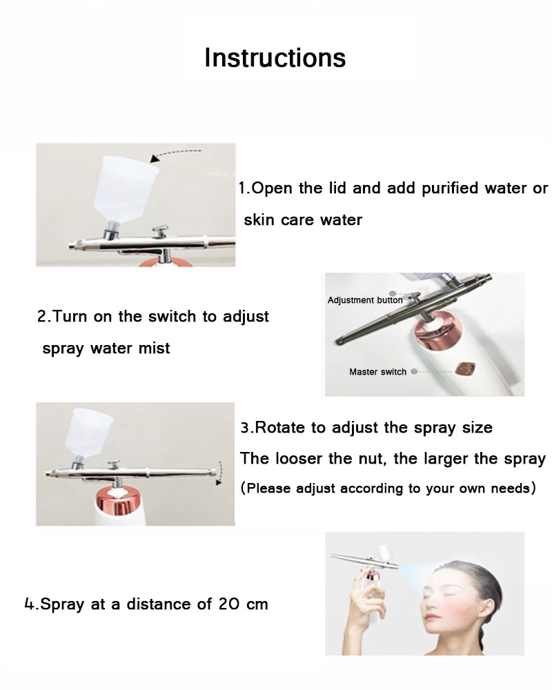 Injectare cu oxigen de înaltă presiune: oxigenul și substanțele active sunt injectate în stratul bazal al pielii prin presiunea pistolului de pulverizare de înaltă presiune. Dispozitivul de injectare și hidratare cu oxigen este echipat cu un pistol special de injectare, care poate injecta serul cosmetic și nutrienții în stratul profund al pielii doar prin apropierea pielii pentru a îmbunătăți absorbția pielii efectul nutritiv.